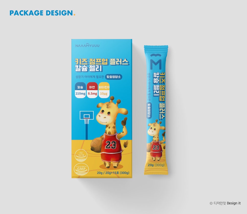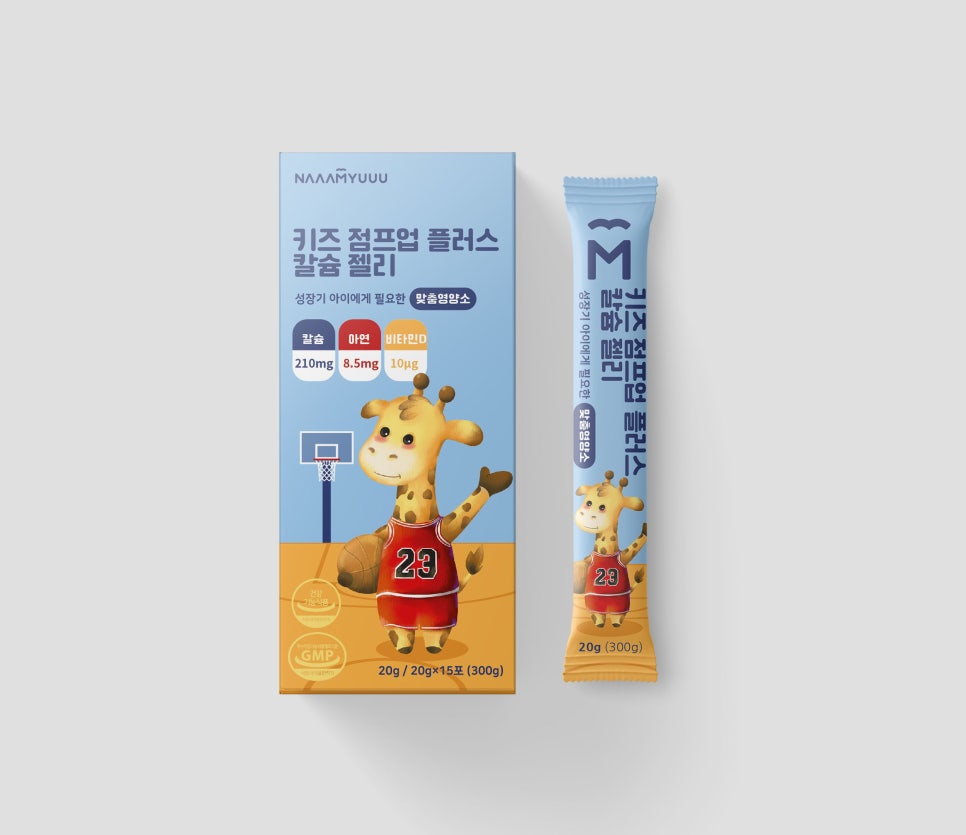 귀여운 기린 캐릭터는 농구공을 들고 있는 모습으로 성장’과 ‘점프업’이라는 제품 메시지를 시각적으로 표현하고 있습니다.